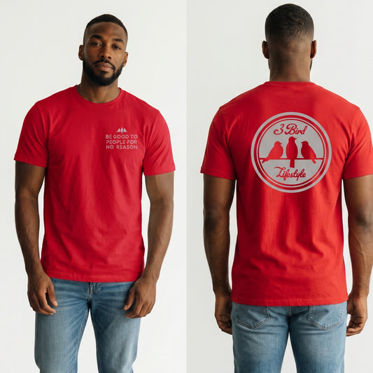 3 Bird Lifestyle T-Shirt • Be Good To People For No Reason • Red & Silver