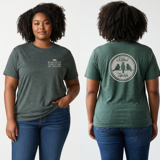 3 Bird Lifestyle T-Shirt • Be Good To People For No Reason • Forest Green & Silver