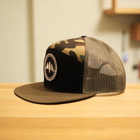 3 Bird Lifestyle Seven-Panel Trucker •Black & Camo & Loden • 3 Bird Lifestyle Patch