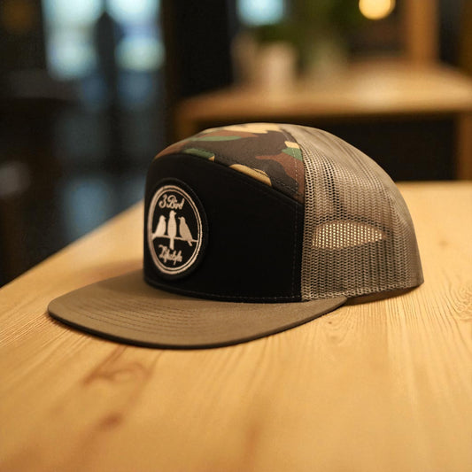 3 Bird Lifestyle Seven-Panel Trucker •Black & Camo & Loden • 3 Birds Only Patch