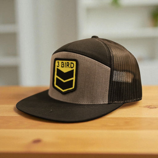 Seven-Panel Trucker • Heather Grey & Black• 3 Bird Patch
