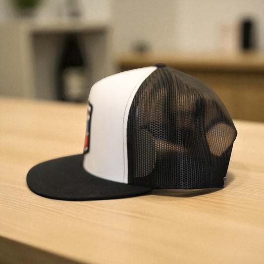 3 Bird Lifestyle Flat Bill Trucker • Black & White • Te Amo (Blue & Red) Patch
