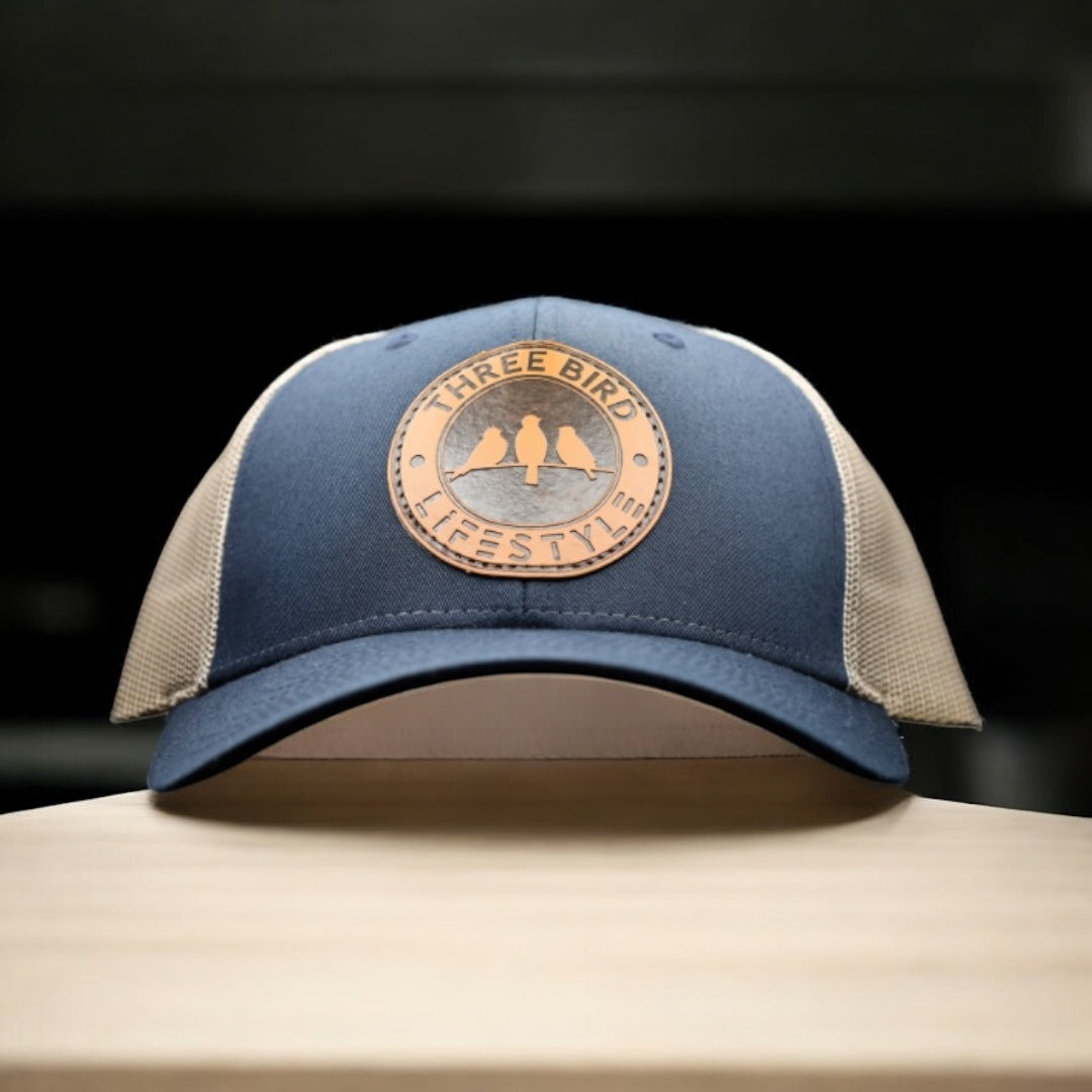 3 Bird Lifestyle Low Profile Trucker Hat • Navy / Khaki • 3 Bird LIfestyle Leather Patch