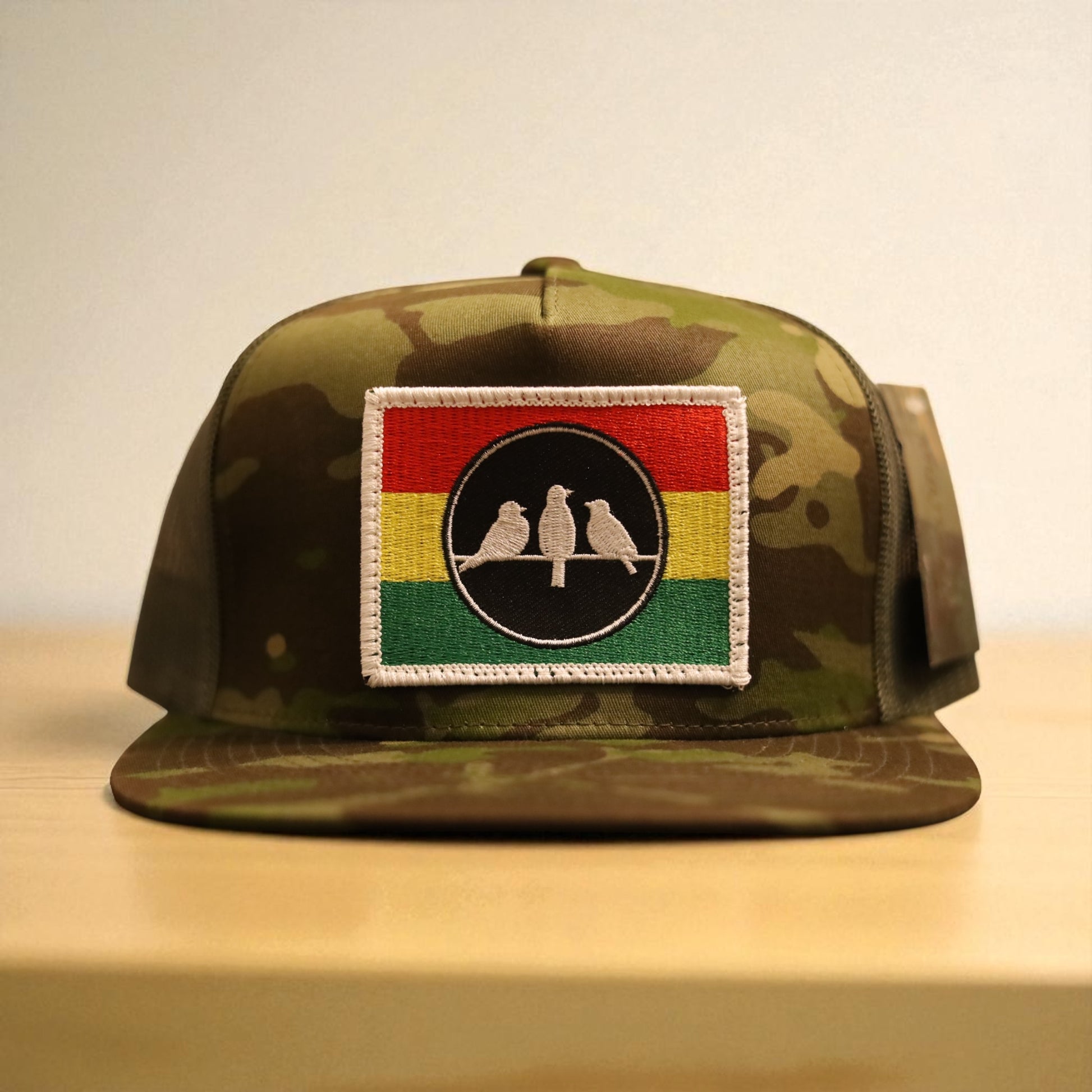 3 Bird Lifestyle Flat Bill Trucker • Multicam Tropic & Green • 3 Bird Rasta Flag Patch