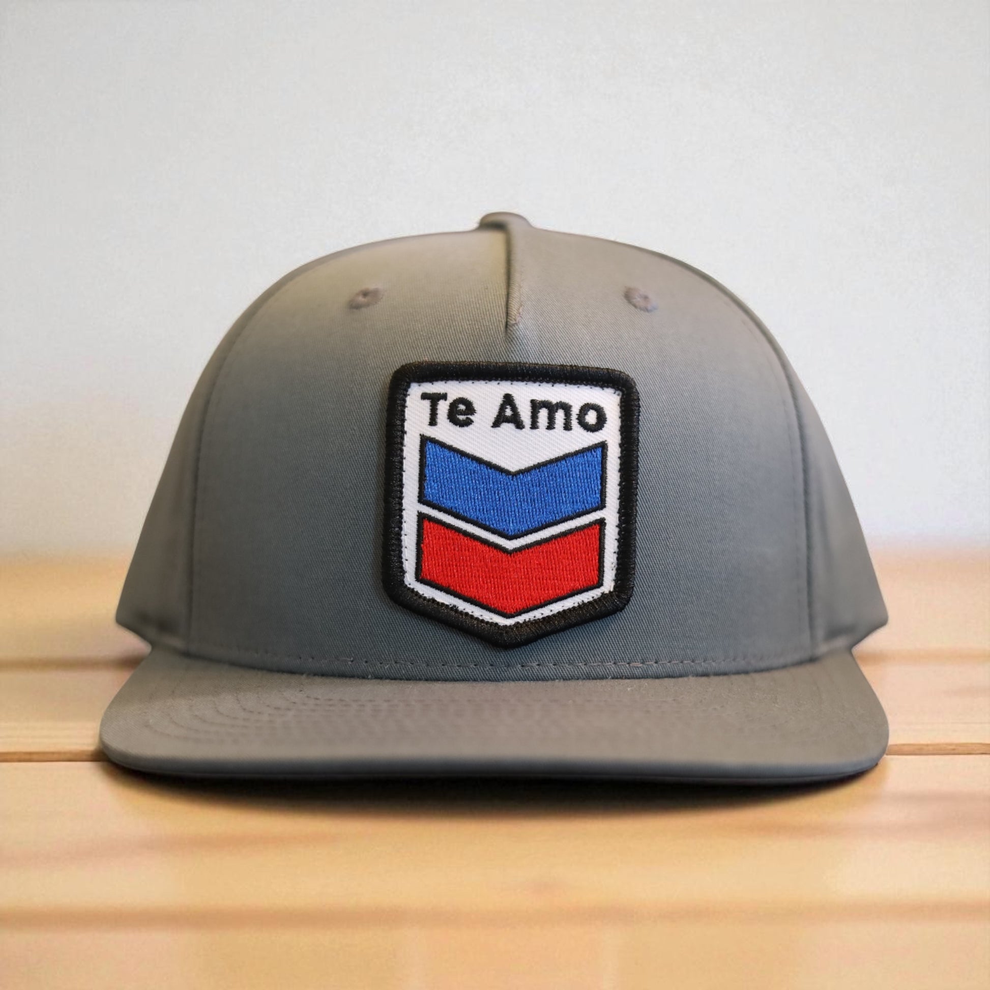 3 Bird Lifestyle Pinch Front Structured Trucker • Heather Grey • Te Amo (Blue & Red) Patch