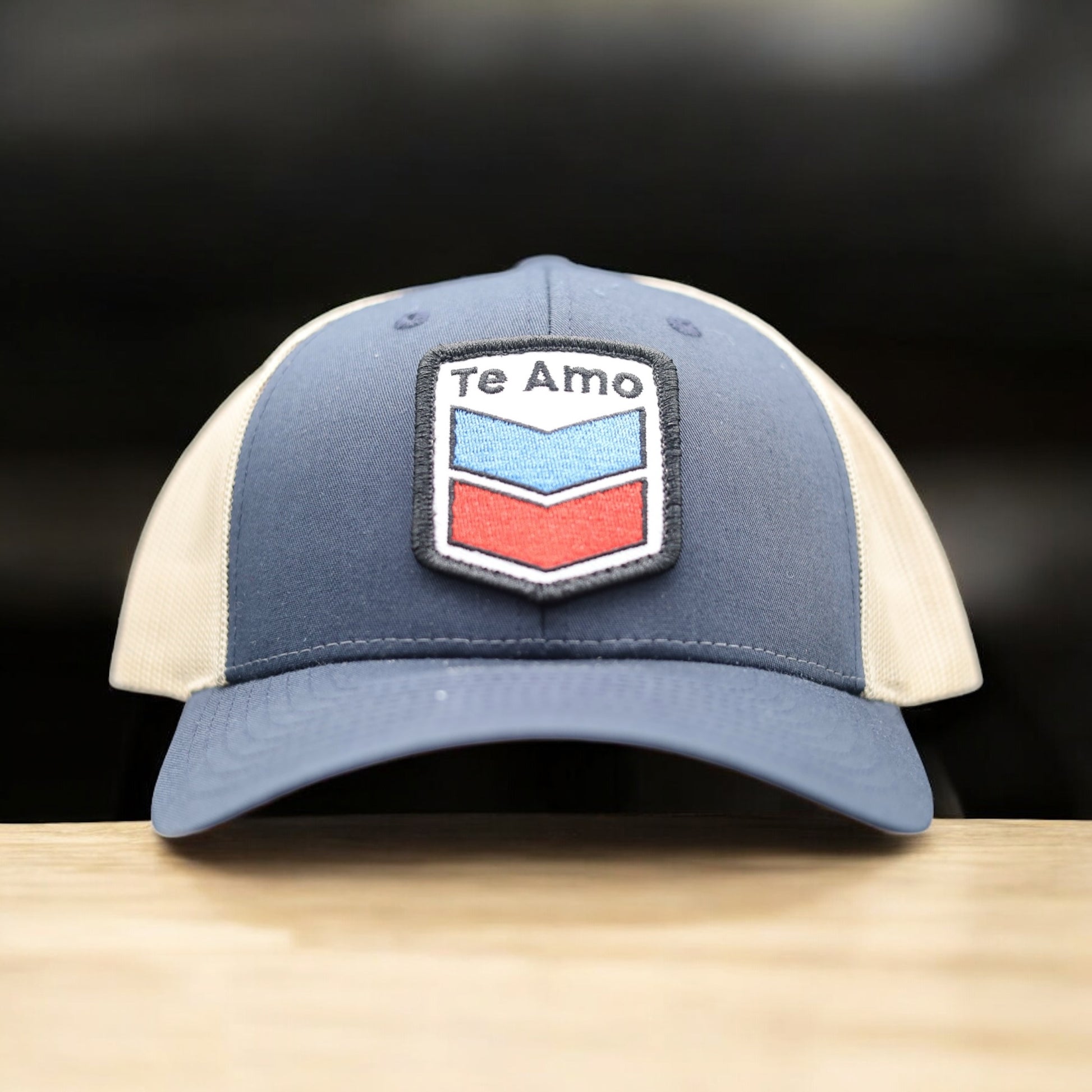 3 Bird Lifestyle Low Profile Trucker Hat • Navy / Khaki • Te Amo (Blue and Red) Patch