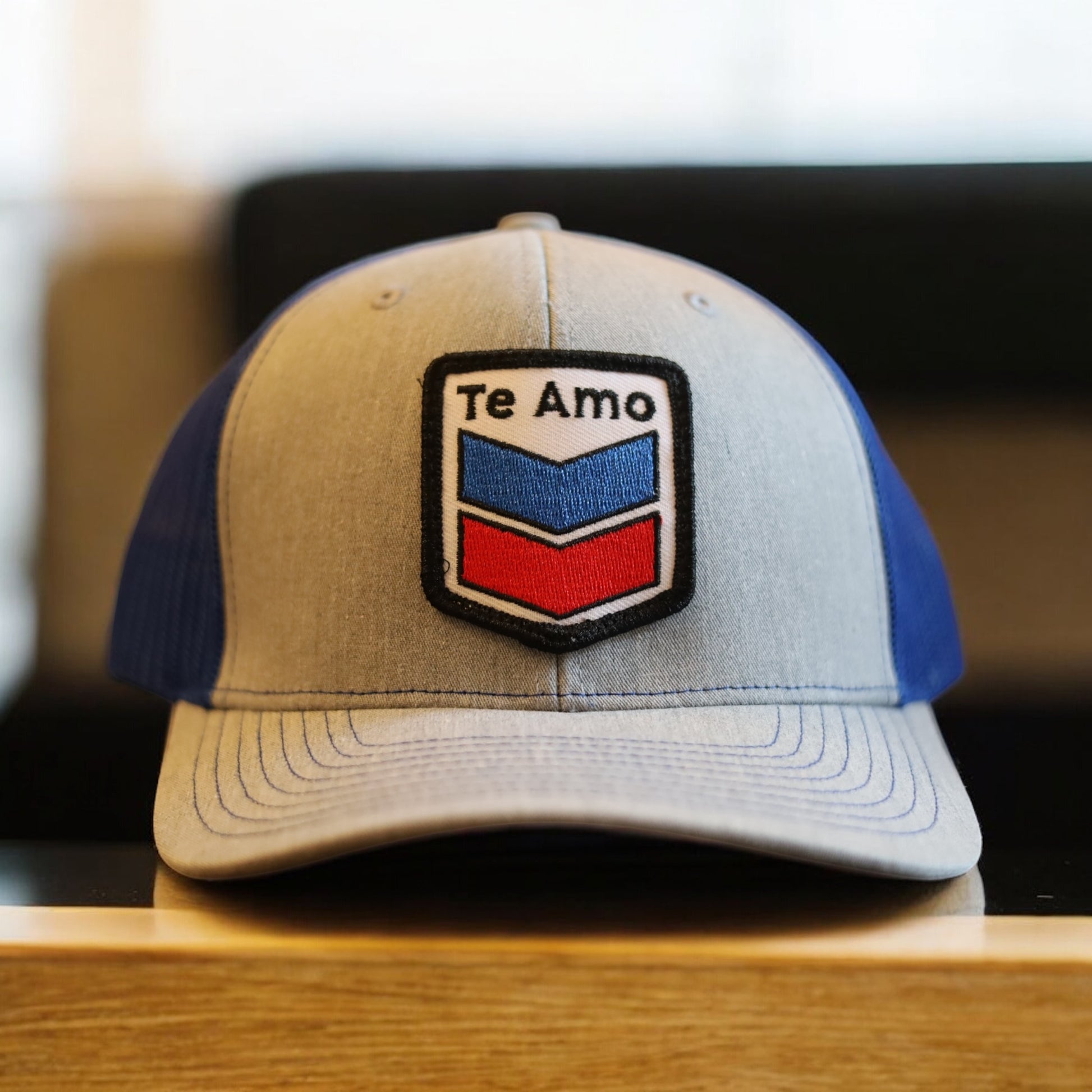 3 Bird Lifestyle Trucker Hat • Heather Grey & Royal Blue • Te Amo (Blue & Red) Patch