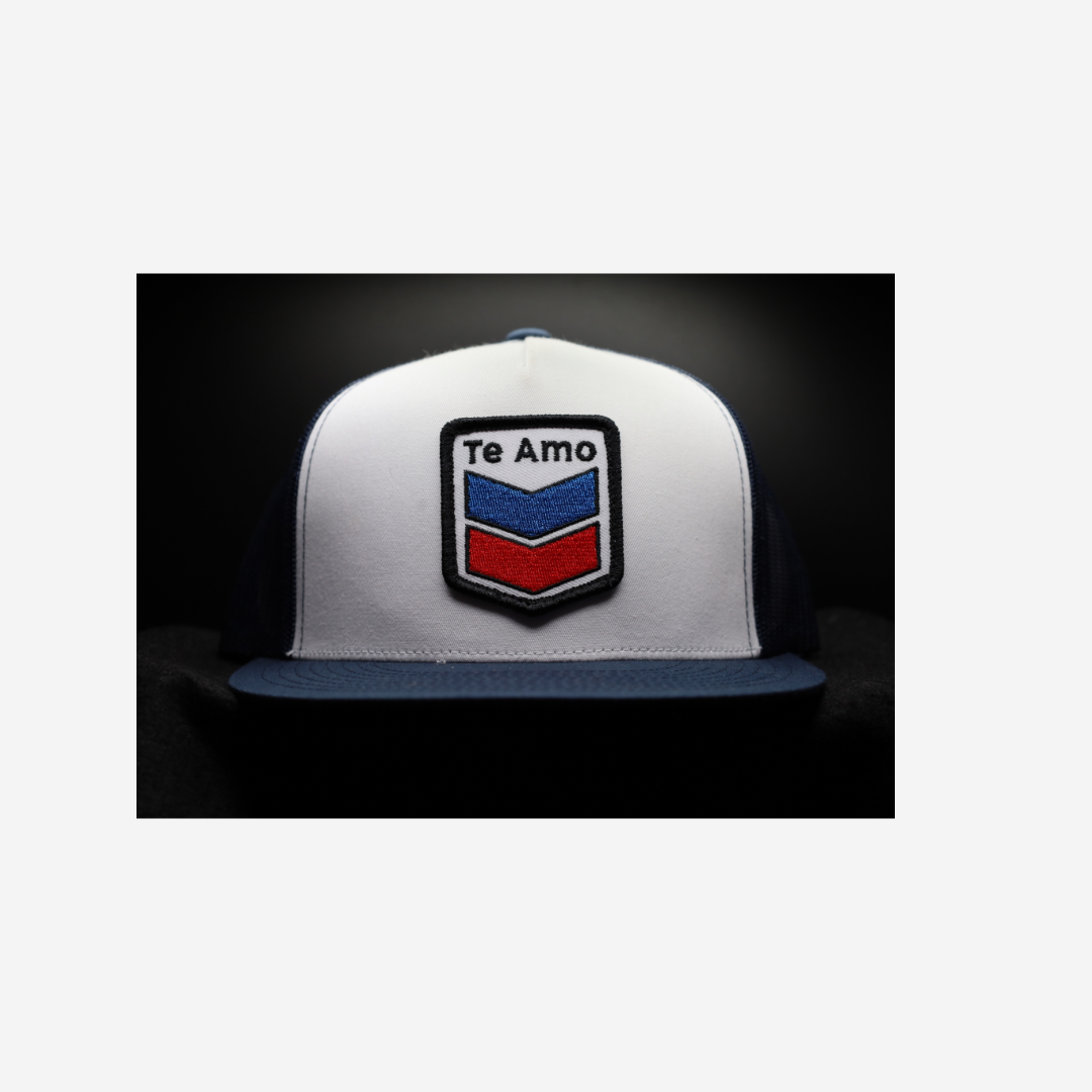 3 Bird Lifestyle Flat Bill Trucker • Navy & White • Te Amo (Blue and Red) Patch