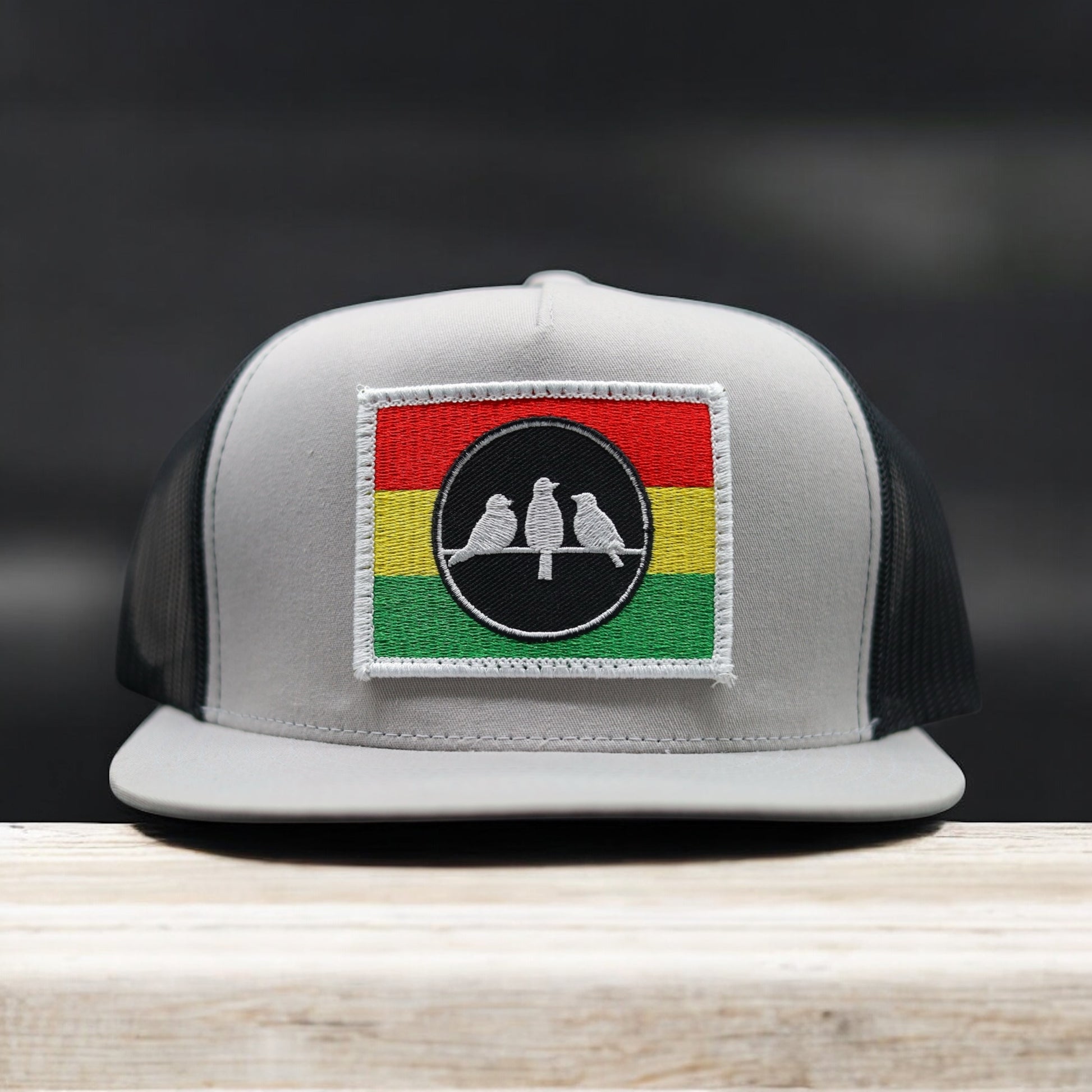3 Bird Lifestyle Flat Bill Trucker •Silver & Black • 3 Bird Rasta Flag Patch