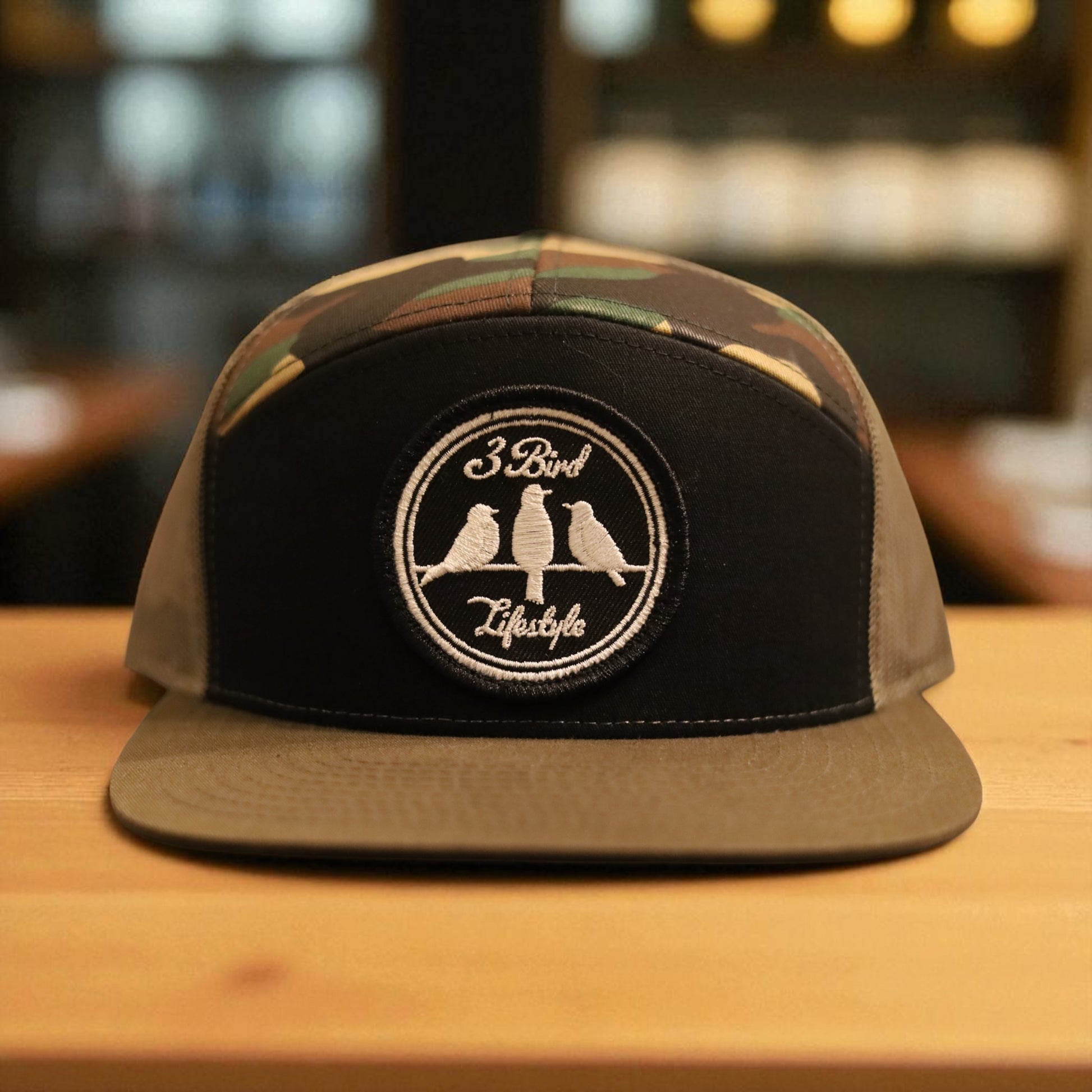 3 Bird Lifestyle Seven-Panel Trucker •Black & Camo & Loden • 3 Bird Lifestyle Patch