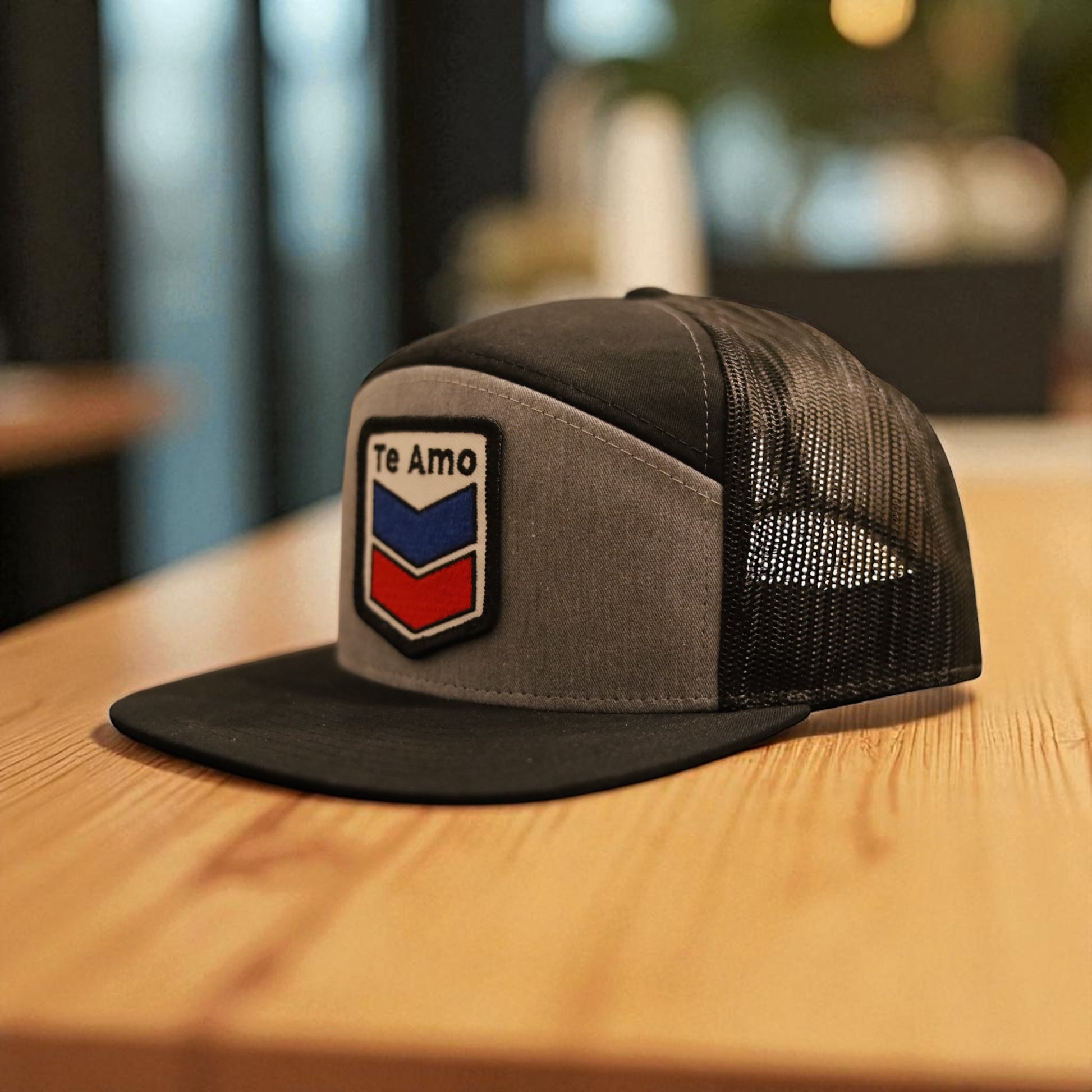 3 Bird Lifestyle Seven-Panel Trucker • Heather Grey & Black• Te Amo (Blue & Red) Patch
