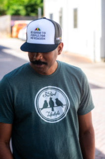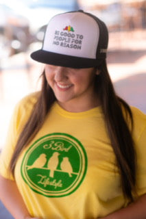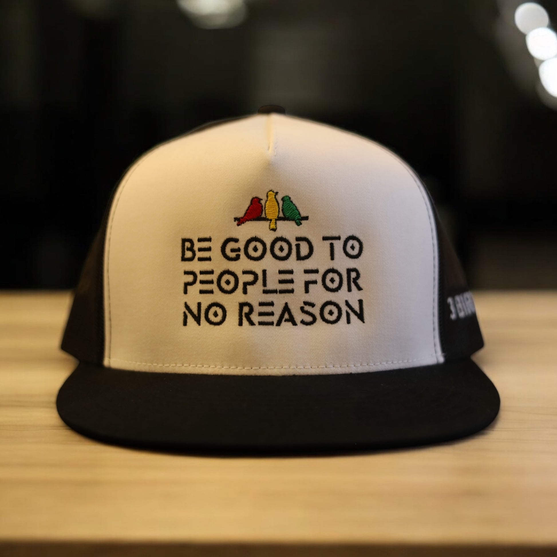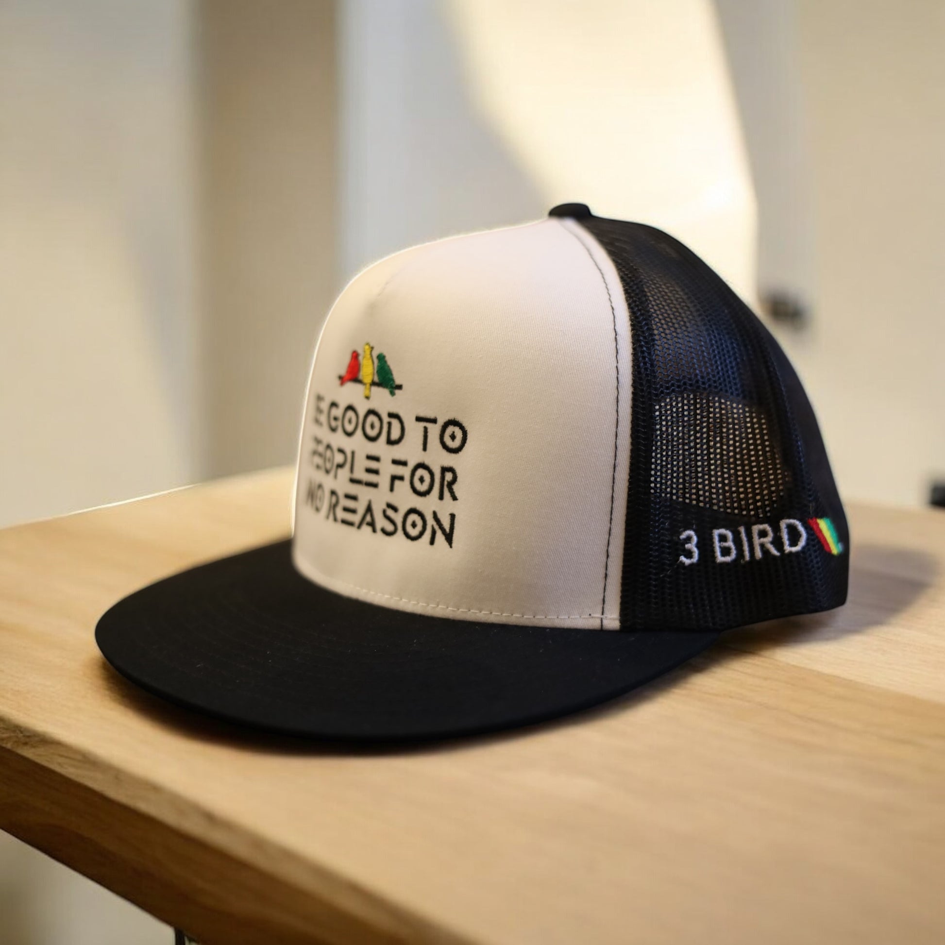 3 Bird Lifestyle Flat Bill Trucker • White & Black• Be Good To People For No Reason • Rasta Birds