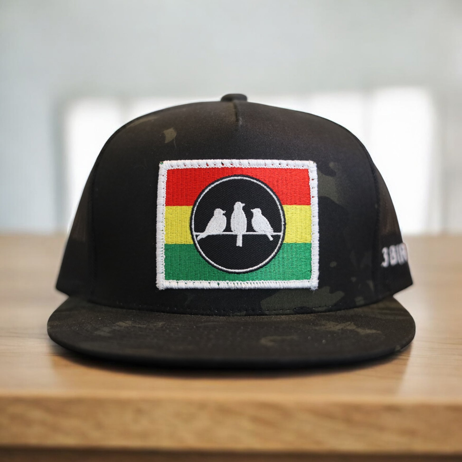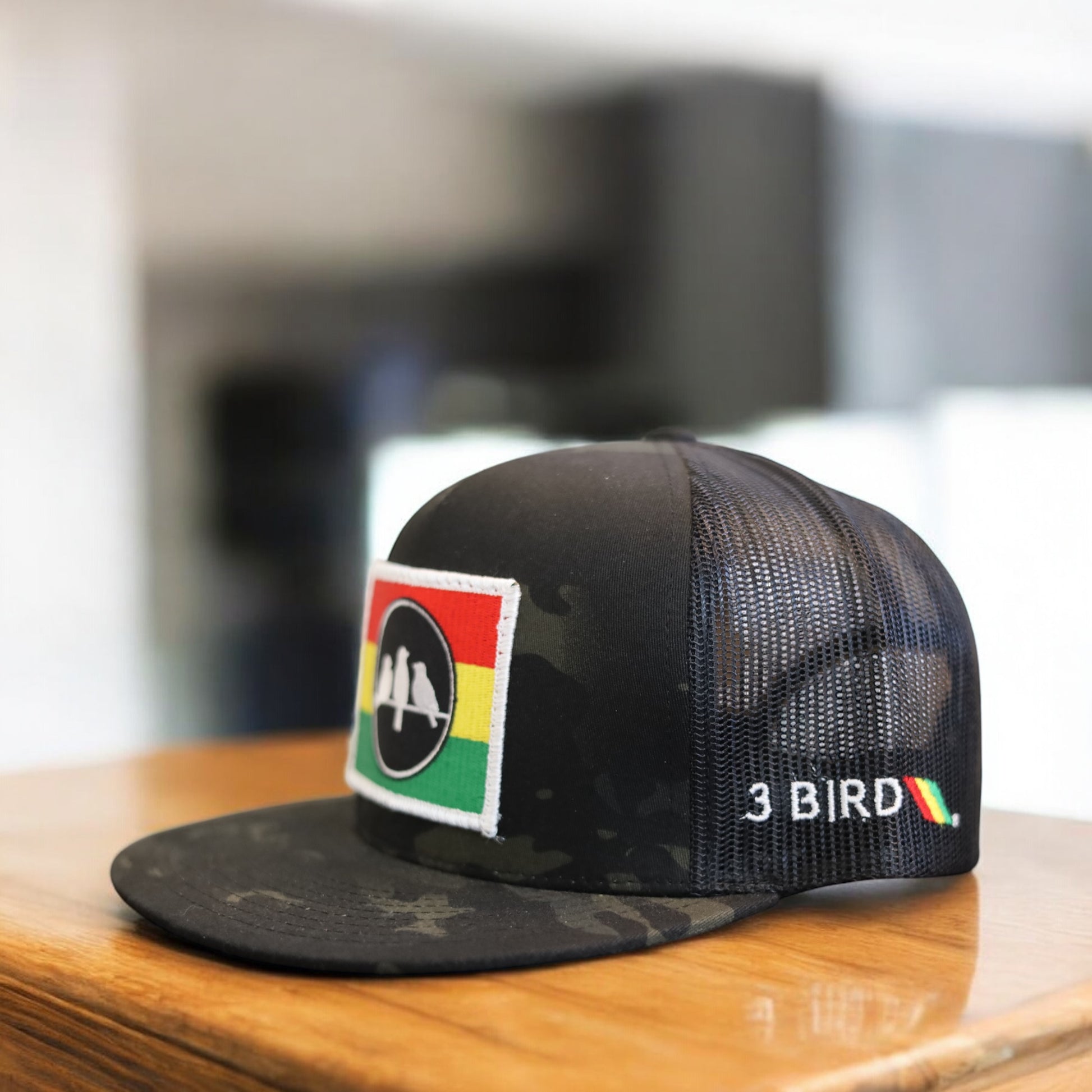 3 Bird Lifestyle Flat Bill Trucker •Multicam Black & Black • 3 Bird Rasta Flag Patch
