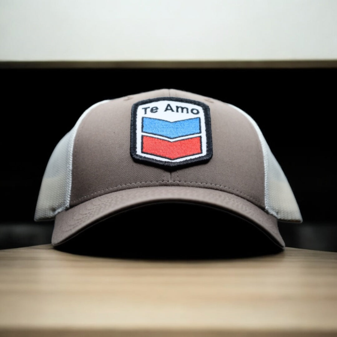 3 Bird Lifestyle Low Profile Trucker Hat • Brown/White • Te Amo( Blue & Red) Patch