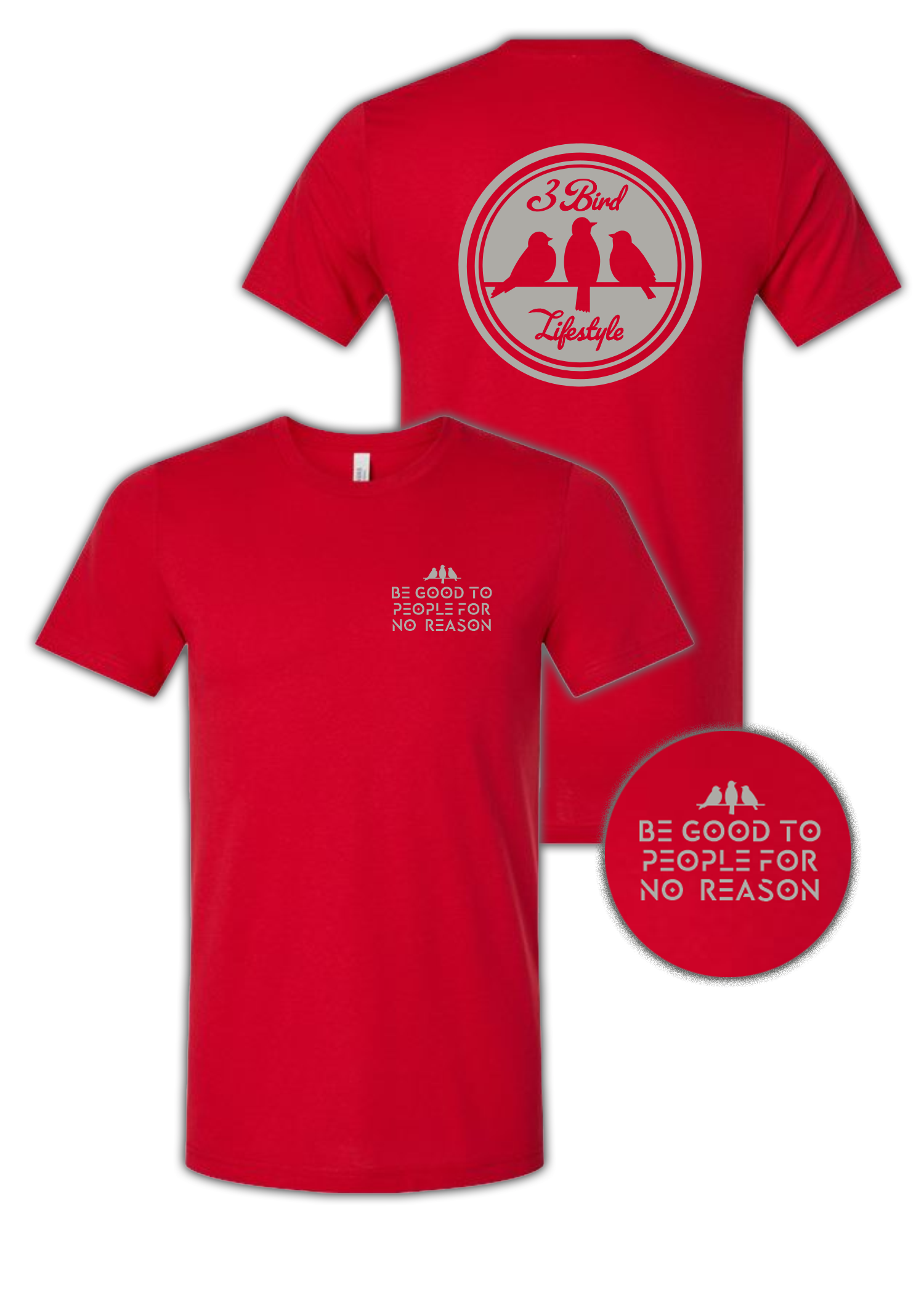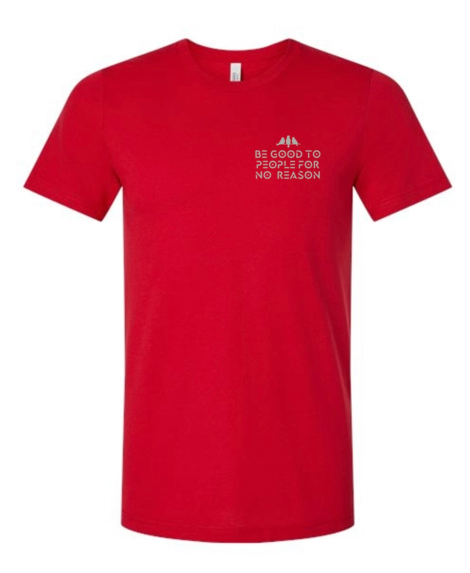 3 Bird Lifestyle T-Shirt • Be Good To People For No Reason • Red & Silver